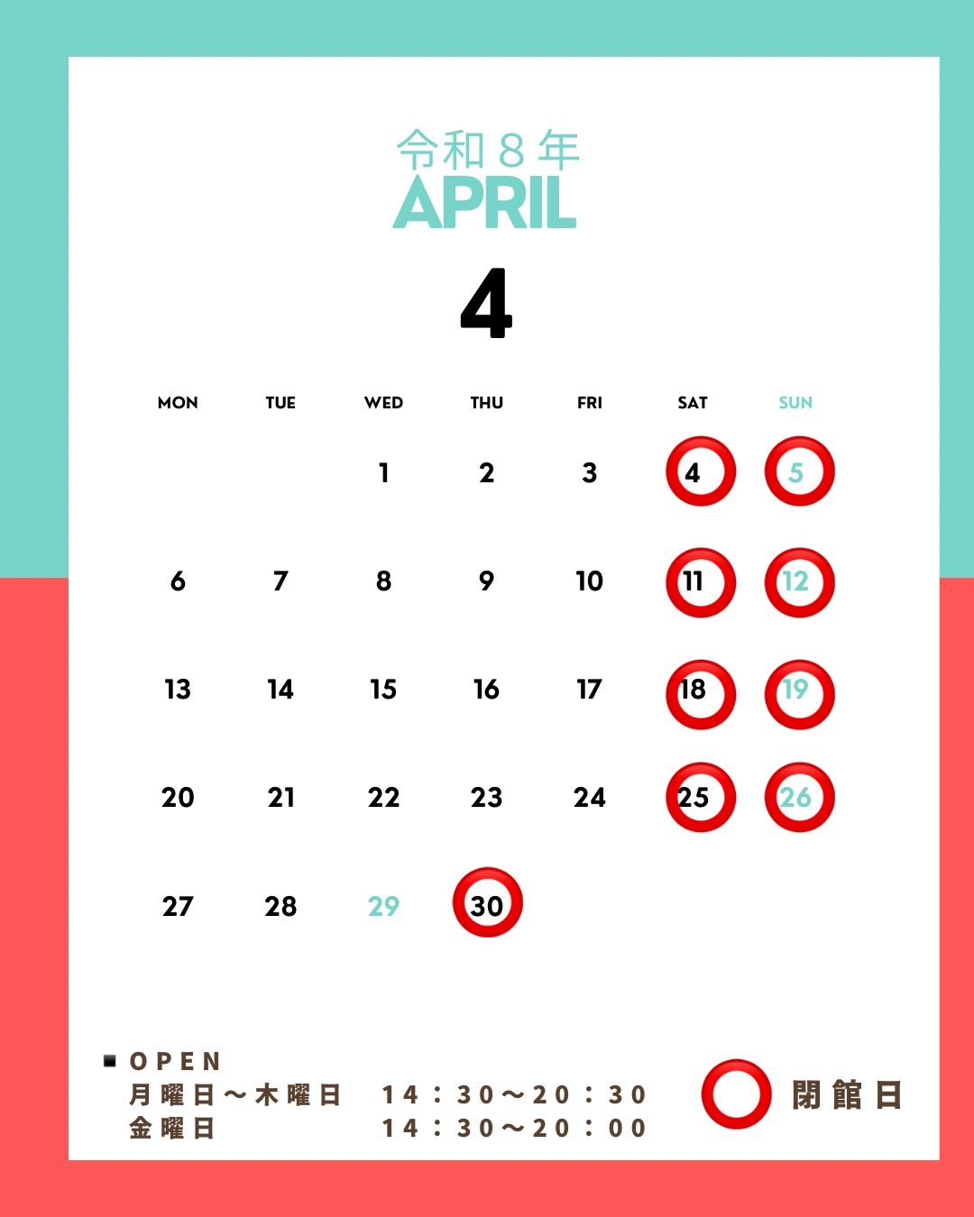 ・4月中の開館は月曜日〜木曜日は14時半〜20時半